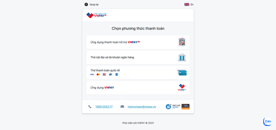 - Bước 1: Chọn Thanh toán qua ứng dụng thanh toán hỗ trợ VnPay QR